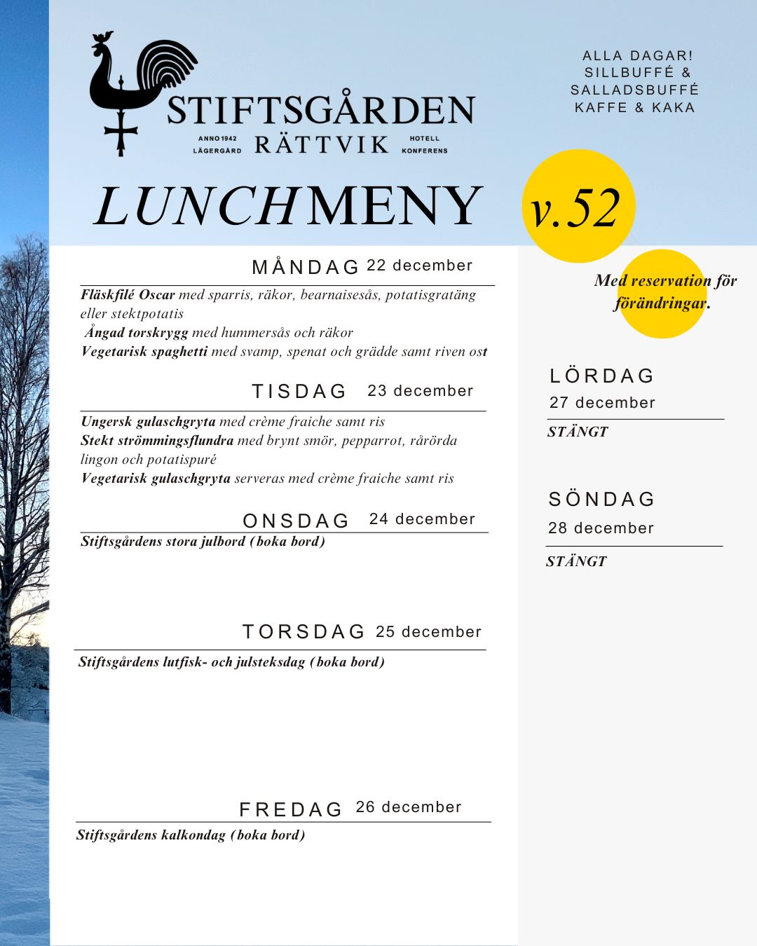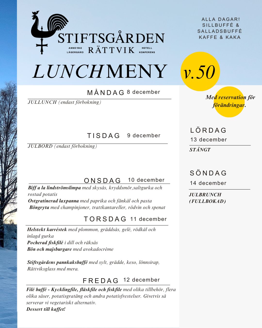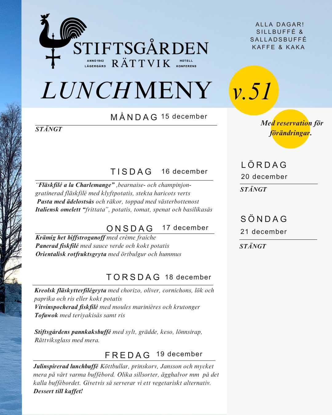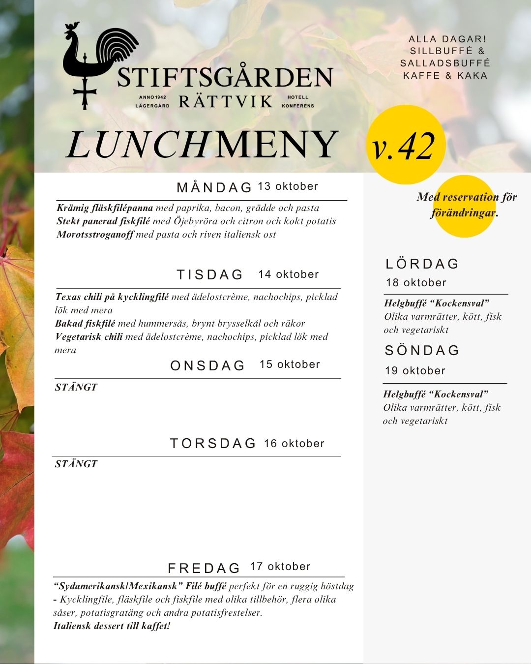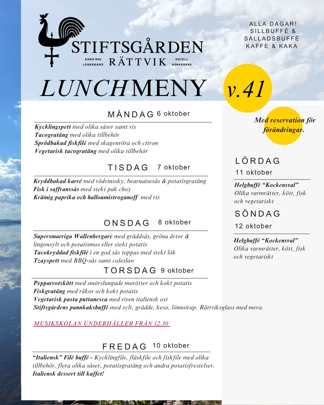 I alla rätter ingår sallad, måltidsdryck, smör och bröd, kaffe/te och liten kaka.